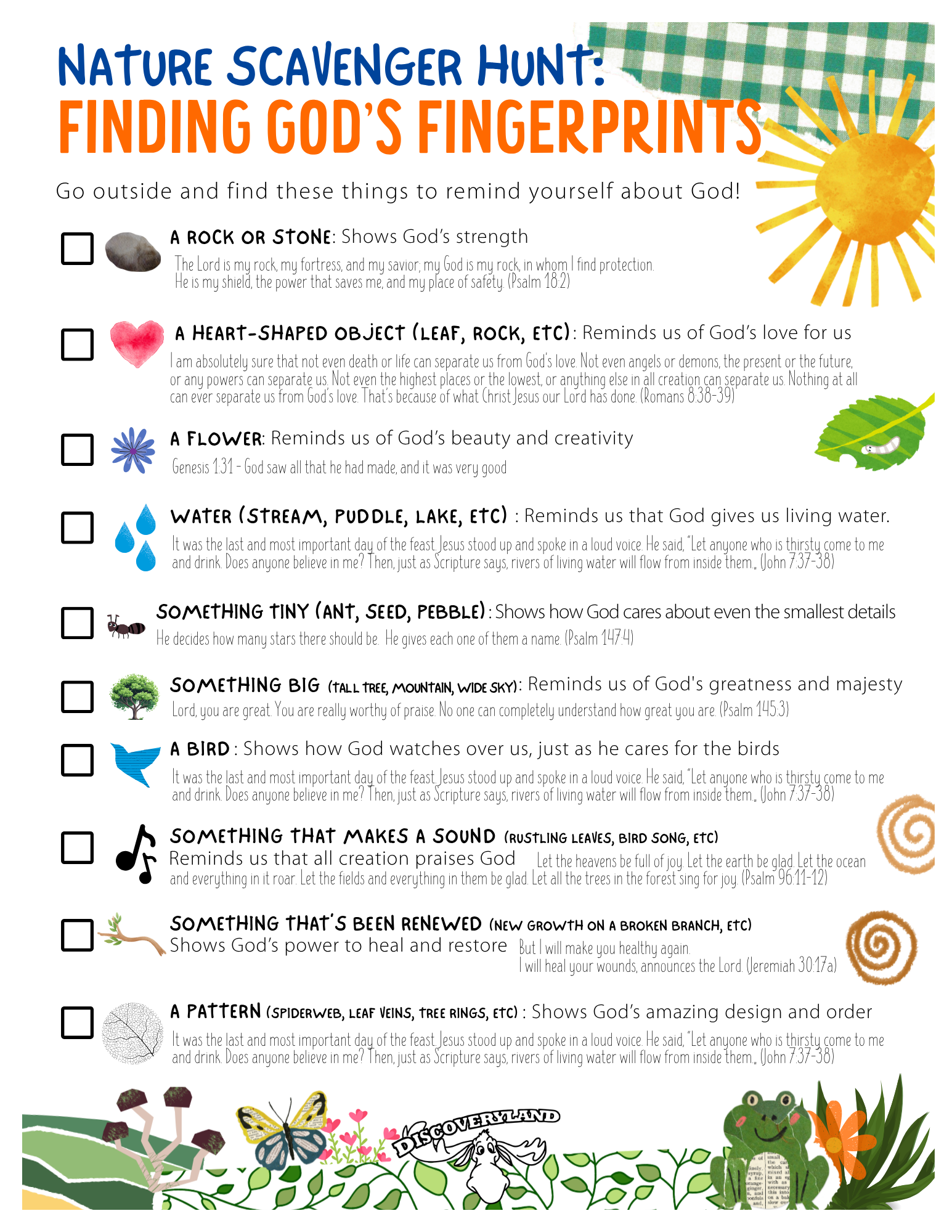 Nature Scavenger Hunt Family Resource Embark on an exciting nature adventure where you’ll explore nature to find hidden treasures, all while discovering the amazing ways God shows His love and creativity in the world around us!